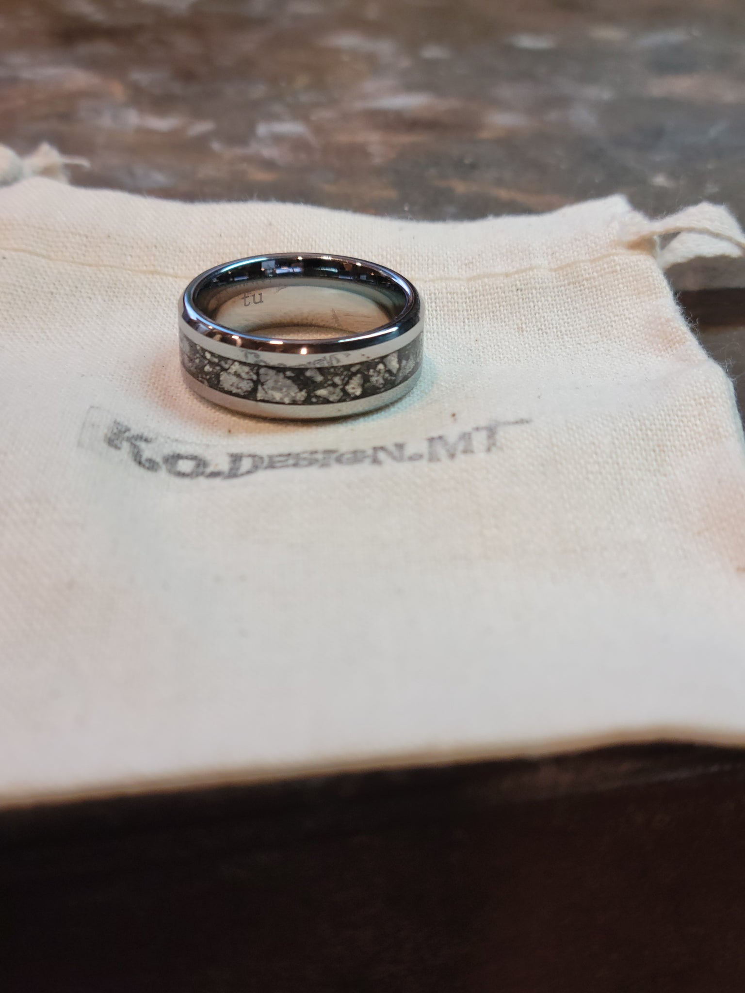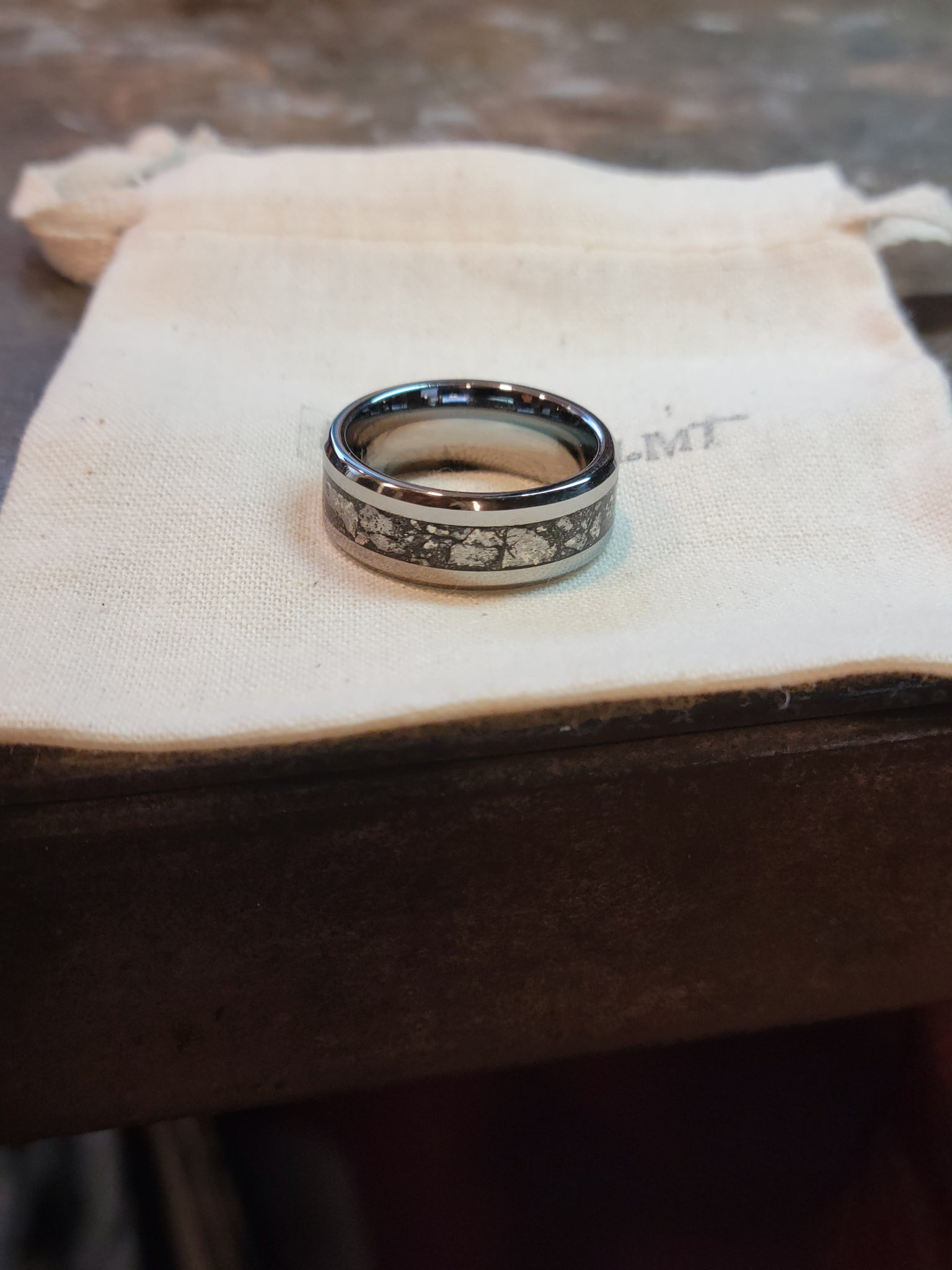 Amazing inlay Sudbury Silver in a Titanium Band.